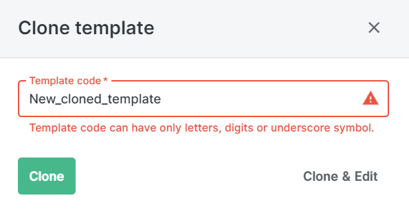 * Kliknij opcję „*Clone template*” . Otworzy się nowe okno, w którym należy wpisać kod dla nowego głównego szablonu. Kod musi być unikalny i różny od oryginalnego szablonu oraz składać się wyłącznie z liter, cyfr lub podkreśleń.