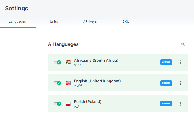 Są tutaj cztery karty: [Języki](https://usermanual.ergonode.com/ergonode-user-manual-pl/system/ustawienia/jezyki), [Jednostki](https://usermanual.ergonode.com/ergonode-user-manual-pl/system/ustawienia/jednostki), [Klucze API](https://usermanual.ergonode.com/ergonode-user-manual-pl/system/ustawienia/klucze-api), oraz [SKU](https://usermanual.ergonode.com/ergonode-user-manual-pl/system/ustawienia/sku).&#x20;