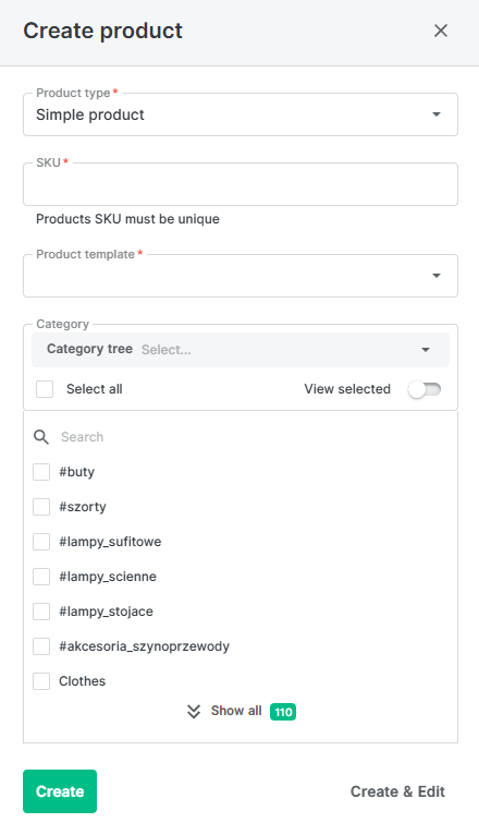 Choose the product template that will be used with this product. Select one or more categories to associate with this product (this step can be skipped). Click Create or Create & Edit, which will take you to the edit mode for the newly created product.