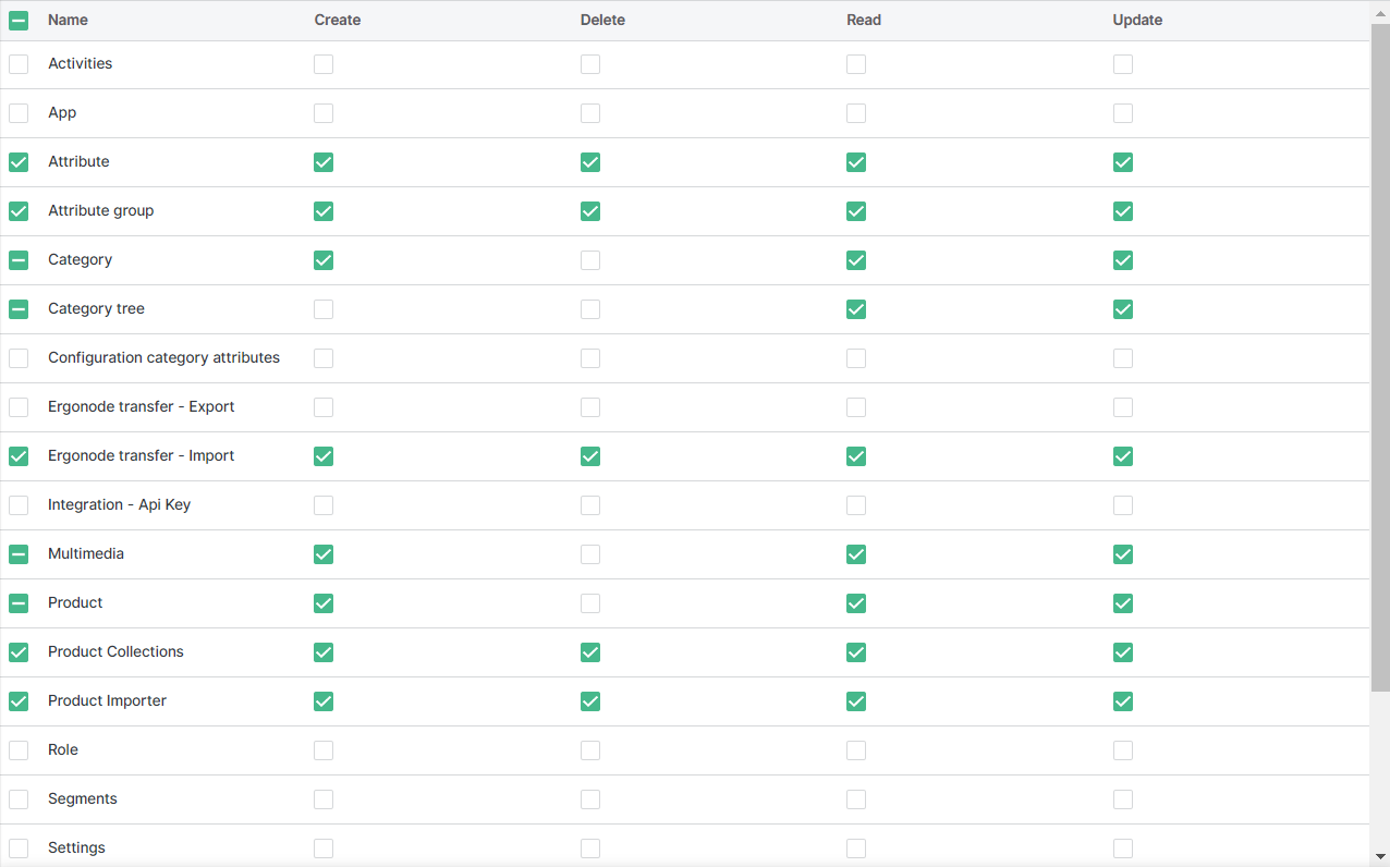 This is straightforward, similar in many aspects to similar sections in many other systems or apps that have user roles, the difference being that Ergonode allows for very fine tuning of these roles. Every small detail can be tweaked to your needs – from imports, attributes, categories, and products, to settings, multimedia and users, and everything in between. Access to each segment can further be defined in four broad levels – create, read, update, and delete.&#x20;